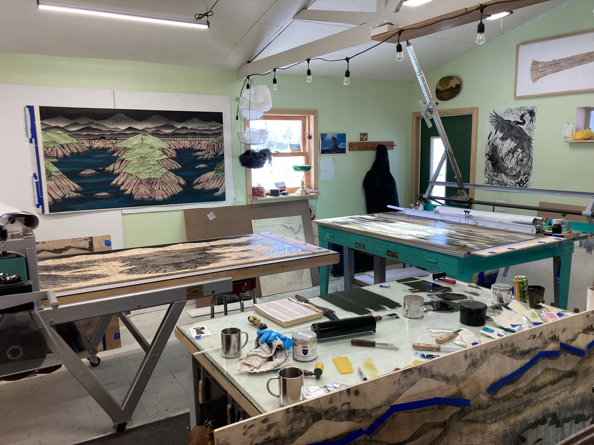 I work from our home studio (SKS Press) . I primarily utilize printmaking processes. I love the democratic nature of multiple impressions, the portability of paper, and the rich history of commentary and dissemination in these media. Personal experience in the landscape, historical research, and the magic and mystery of the natural world drive my creative practice.